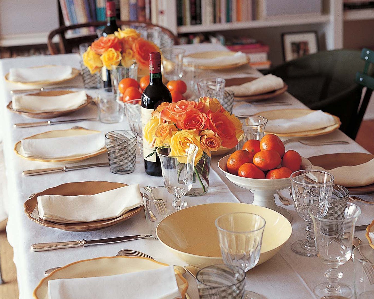 I’ll set the table and choose all the serving dishes the day before. I like solid colors for plates and platters — patterns don’t make food look as good. I light a fire in the fireplace and put vases of flowers and bowls of clementines on the table!
